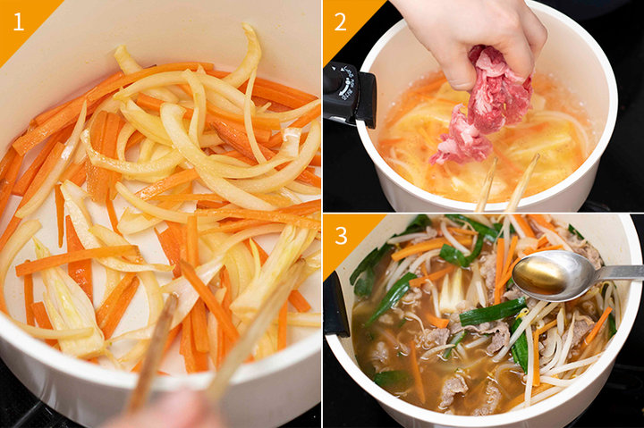 きめ細かく、とろけるような柔らかい食感の近江牛を使ったスープ。汗ばむ日も多くなってきたので、少しピリ辛の韓国風に仕立てました。野菜をたっぷりと入れて、バランスのとれた一杯に。 【材料】(2人分) ・牛肉…200g ・もやし…1/3袋 ・ニラ…1/3束 ・玉ねぎ…1/4個 ・人参…1/4本 ★コチュジャン…大さじ1 ★すりおろしにんにく…小さじ2 ★ごま油…小さじ1 ★砂糖…小さじ1 ★中華だし…小さじ1 ★オイスターソース…小さじ1/2 ★醤油…小さじ1 ★水…400cc ・ごま油(仕上げ用)…小さじ1 ・塩…少々