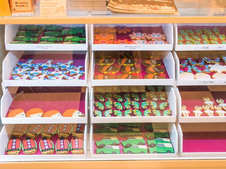 カウンターには、ばら売りのビスケット(各3ポンド)も。子どもが喜びそうなデザインがいっぱい