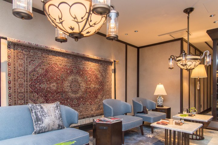 ペルシャ絨毯など豪華な調度品を備えた空間で、ソファに座ってチェックインを。