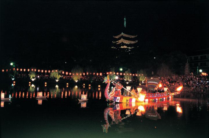 興福寺といえば、奈良観光では外せない、全国で2番目に高い五重塔。五重塔とは、お釈迦さまのご遺骨を奉安する仏塔の形式の一つ。室町時代に建てられ、その後5回の再建をへて現在は50.1メートルもの高さがあります。五重塔以外にも、北円堂・三重塔・東金堂などの国宝があります。興福寺国宝館には、3つの顔と6本の手を持つ阿修羅像や仏像などの寺宝が展示されています。春と秋には、建物の特別公開扉や仏像の特別拝観も行われます。