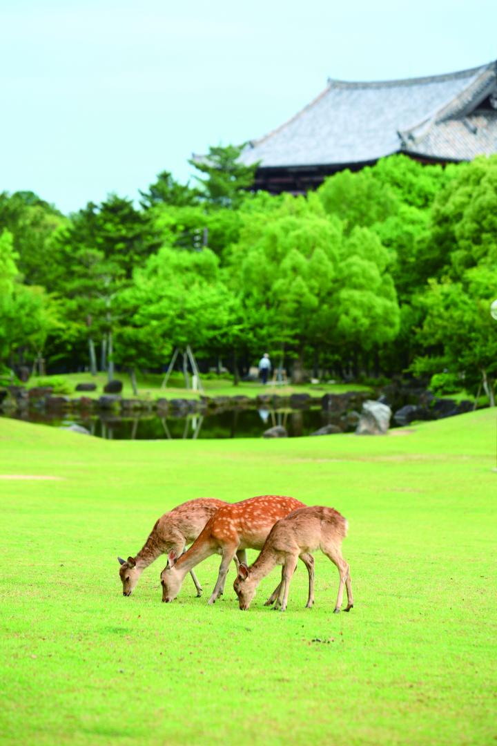 奈良市にある県立公園の「奈良公園」。660ヘクタールもの広大な敷地内には、東大寺、興福寺、春日大社などの由緒正しき寺や、奈良国立博物館などが建っています。公園内のほとんどは芝生となっており、1100頭ほどの鹿が生息しています。桜や紅葉の名所としても有名なんですよ。