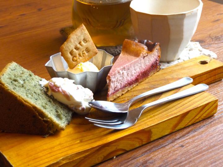 自家製のオーガニック素材にこだわったケーキが、多くの女性に支持されている「fete cafe(フェテカフェ)」。通常の半分のサイズのケーキ2種に、アイスクリームとドリンクなどが付いたハーフ&ハーフのケーキセットが人気です。自家製の果実酢ドリンクと一緒に召し上がれ。