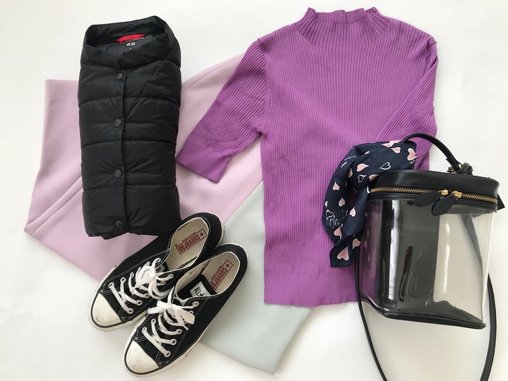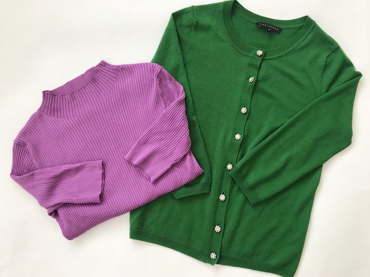 ①明るいカラーのトップス:白、パープル、グリーンなど、明るい色のトップスを上半身に持ってくるだけで、爽やかな印象になります。