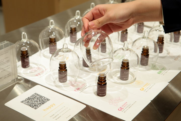 「アロマオイルブレンダーサービス」(2700円~)では、オリジナルブレンドのアロマオイルを作ることができます。好きな香りだけではなく、使用するシーンや家具やカーテンの色、身体のコンディションなどをカウンセリング。配合された香りは実際に空間に広げて、すぐに確かめることができます。納得いく香りができあがるまで何度も調節することもできるのも嬉しいですね。