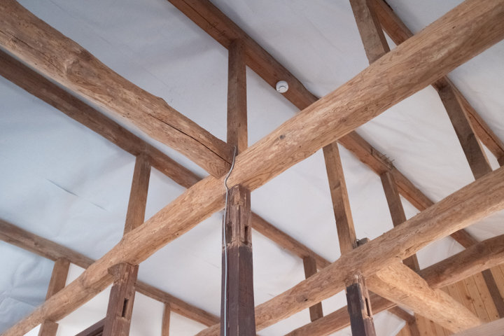 2階の天井は古民家の柱や梁がそのまま使われている(天井は取材時改装中)