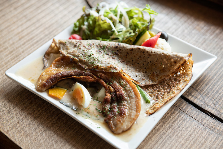 鹿沼の豚、地野菜、地元の蕎麦粉を使った「さつきポークの具だくさんガレット」ドリンクセット1,600円。