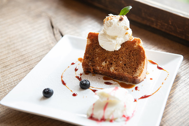クリームチーズのアイスを添えた「キャラメルシフォン」ドリンク付きで1080円。