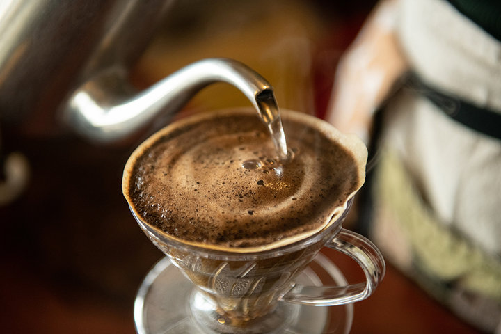 適正温度でドリップできるよう選ばれたケトルで丁寧にコーヒーを淹れる。