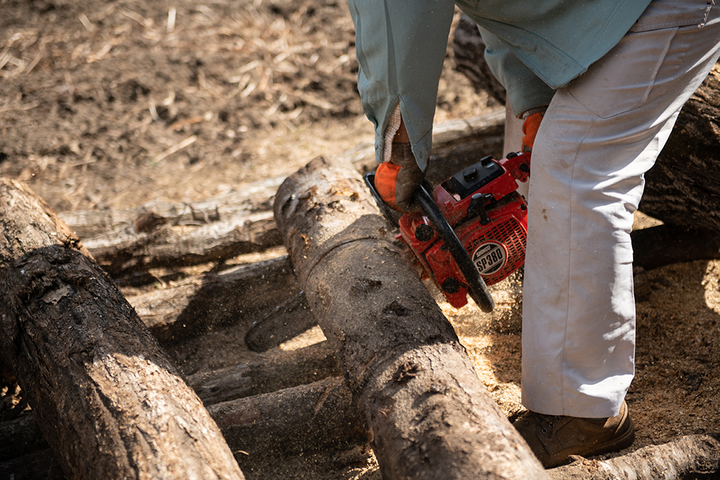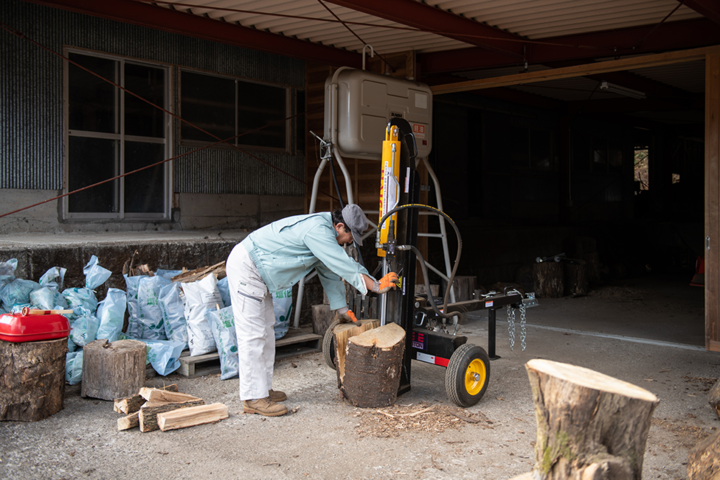 今回、店内を取材させていただくなかで真っ先に目についたのは、温かな炎が揺れる薪ストーブでした。その話をすると、「では次は薪を切るところをご覧になりますか?」と星野氏。先の炭焼き小屋とは違う方角にクルマを走らせること数分。ついた先には大ぶりの丸太がごろごろと転がっています。「この辺りの間伐材を薪にしているんです。毎日、相当量を使いますので、とても買ってなんていられません。薪を割るのも自分達です(笑)。チェーンソーを使うところなんて、なかなか見る機会はないでしょう?」。刃に詰まったチェーンソーオイルを取り除き、混合燃料を注入してスイッチを入れれば、青空に勢いよくブルン、ブルン、チュイィィィンという音が響きます。