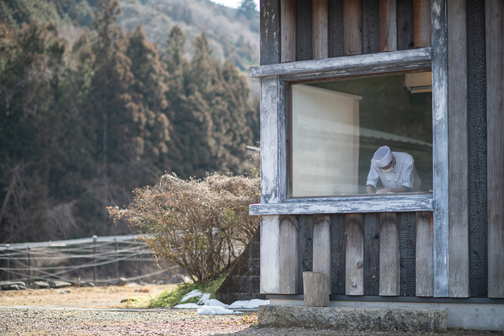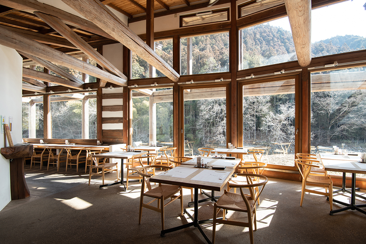 建物や粉挽き棟に使用されているのは、樹齢80年以上の地元の杉。切りだした杉160本をハンドカットし、組み上げたのは、現代ログハウスの神様、アラン・マッキーの薫陶を受けた日本屈指のログビルダーたちです。梁に丸太を使用しているので骨太な印象ですが、漆喰と組み合わせることでしっとりと落ち着いた空間に。「地域活性化を謳った論文や書籍は多いですが、実践してみないと説得力がありませんから」と星野氏。この他、『山帰来』では敷地内にひいた清流で山葵を育て、調理師免許を持つ地元の若者を雇用して蕎麦職人として育成。付近の耕作放棄地約3haで蕎麦を栽培するなど、地域活性化の一端を担っています。