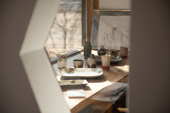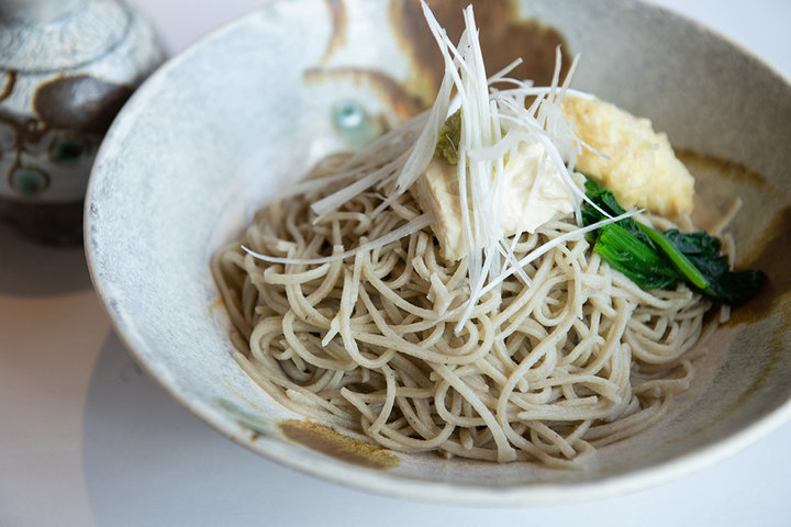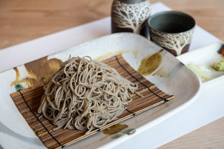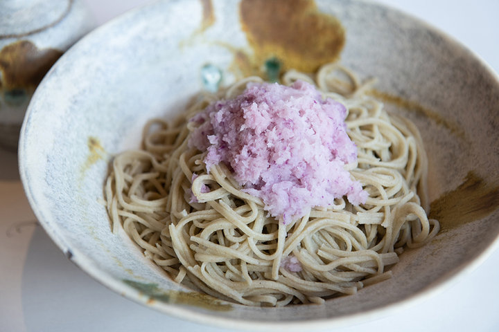 『小来川 山帰来』では、自家栽培した玄そばを別棟で保存し、その日使う分のみを自家製粉しています。手打ちにこだわった蕎麦は十割と二八の2種。存在感のある十割蕎麦をはんなりと上品なつゆにくぐらせて口に運べば、蕎麦の香りがぱっと口中に広がり、鼻腔をも満たします。可憐な薄紫色の辛味大根を使った「辛味大根おろし蕎麦」は、みずみずしい蕎麦の喉越しの後から爽やかな辛味が追いかけてくる一品。日光名物の新鮮な汲み上げゆばの刺身を二八蕎麦の上に乗せ、さらにゆばの天ぷらを乗せた「ゆば蕎麦」も人気です。そんな蕎麦の美味しさを倍増させてくれるのは、山帰来や桜など、山間地の樹木を象嵌の技法で表現した器たち。すべて、益子の陶芸家・佐伯守美氏によるオリジナル作品です。