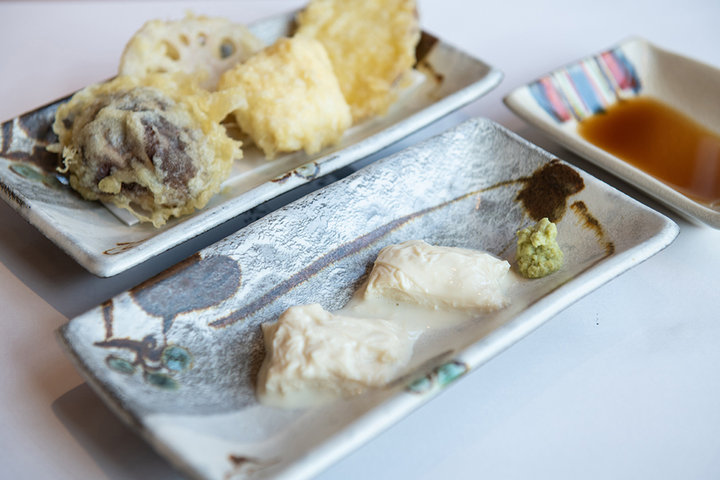 「ゆばと季節の天ぷら」500円(奥)、「ゆばのおさしみ」500円。