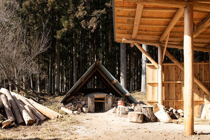 星野氏と周辺の農家の方々による手作りの炭焼き小屋。何でも作ってしまうバイタリティーに脱帽。