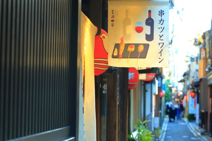 初夏の訪れを告げる京の風物詩といえば、5月はじめから鴨川沿いにお目見えする納涼床。9月末までの間、二条~五条の鴨川西岸に連なる床席が日暮れとともに浮かび上がる様子は風情たっぷりです。和・洋・中をはじめさまざまなジャンルのお店が約100軒近くあるなか、女性ひとりでも気軽に入れる一軒「串カツ&ワイン 侘家洛中亭(わびやらくちゅうてい)」をご紹介します。