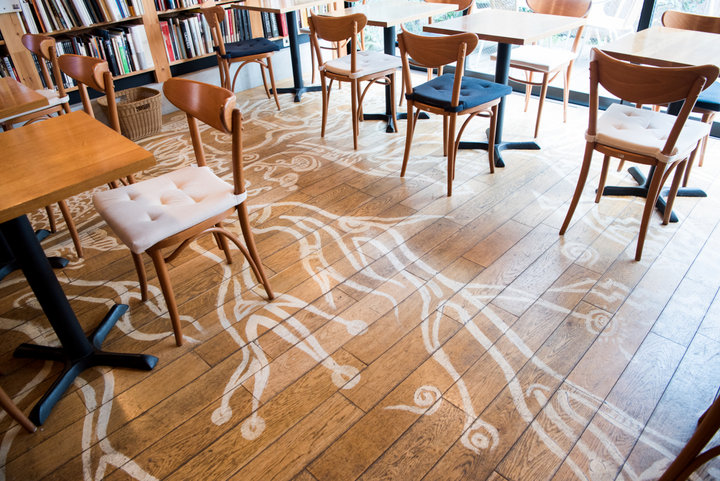 恵比寿駅から徒歩10分。木のぬくもりに溢れた開放感のあるお店が「写真集食堂めぐたま」です。一歩お店の中に足を踏み入れると、壁にぎっしりと並べられた写真集、そして床一面に描かれた床絵が目に入るはず。床絵は、お店のオープンの際に写真評論家である飯沢耕太郎さんが描いた作品「生命(いのち)の樹」。よく見ると、入口から木が伸びていて、動物や魚などの生き物が髄所に隠れています。建物は「エアロハウス」という柱のない建築方法を採用し、広々とした空間を生み出しています。