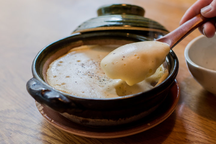 めぐたまでぜひ味わってほしい一品が、今から100年前に出版された食の啓蒙家・村井弦斎(むらいげんさい)の恋愛小説「食道楽」に登場するレシピを再現したメニューの数々。軽い食感で素朴な味わいの「糠ケーキ」、よく温めたタレに鮪をくぐらせ温かいご飯の上にのせた「泣きごはん」を提供しています。 また、徳川第三代将軍・家光が天皇に献上し、新撰組の近藤勇も大好物だったと言われている江戸時代の料理「たまごふわふわ」も人気のメニュー。ふわふわの卵と丁寧に作られた出汁が口の中でまじり合う、ジュワッとした口当たりが特徴です。