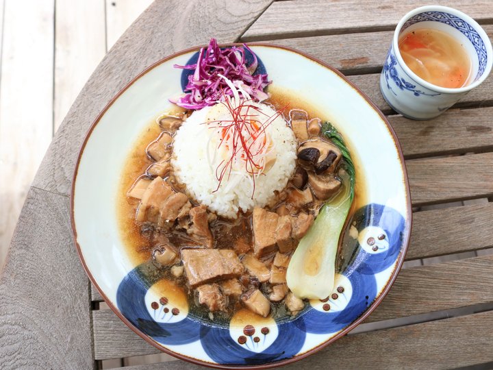 お昼時のランチにも様々な香辛料が隠し味で使われています。 台湾のソウルフード「ル―ロー飯」は、シイタケとモチ豚をメインに香り高い五香粉と八角、紹興酒で日本人に合うように味付けして食べやすいあんかけに。おいしい日替わりスープつきです。