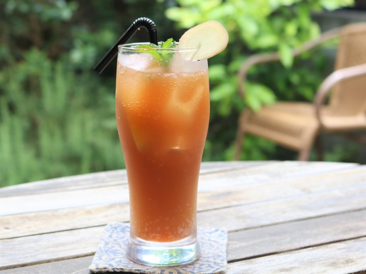 見るからに濃厚そうなジンジャーエールには、おろしショウガがどっさり! ミキサーでは味が変わってしまうため、ショウガを丁寧に手ですりおろします。そこに奄美諸島産の素焚糖という黒糖と八角、シナモン、グローブ、レモン汁を合わせた自家製ドリンク。炭酸も控えめで、乾いた喉や体にゆっくりとしみわたります。