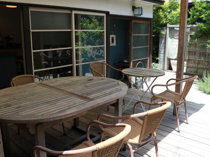 中に入るとすぐに、ほどよい広さのウッドデッキのテラスが広がります。屋根があるのでお日様がでていても安心、友達との楽しい会話が弾みそう。一人でもお気に入りの本や雑誌をじっくり読むのによさそうです。
