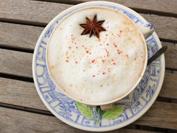 もしも魔法の国に行ったら、こんなティーカップが出てきそう……。 そんな事をふと連想してしまいそうなほど大ぶりのティーカップに注がれたチャイ。水を使わずに北海道の濃厚牛乳でじっくり煮出すため、葉の開きやすい細かい茶葉を使います。シナモン、ジンジャー、クローブ、カルダモン、グローブといった香辛料がブレンドされて味わい深く、たっぷりのミルクフォームに浮かぶ八角とピンクペッパーからもいい香りが漂います。暑い時期は冷たいアイスもいいですよ。
