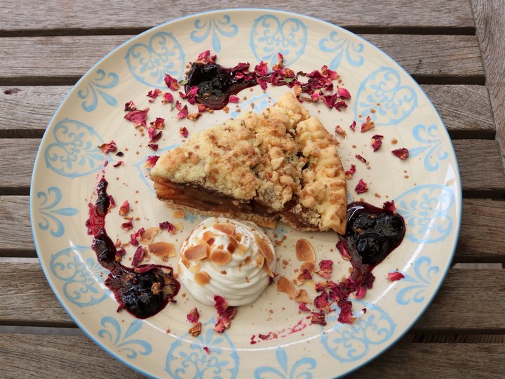 リンゴと一緒にたっぷりのシナモンとレーズンを煮込んで焼いたアップルパイは、クランブル生地のサクサクした食感も新鮮で、レモン汁を加えることで後味はすっきり。温かくして提供してくれます。