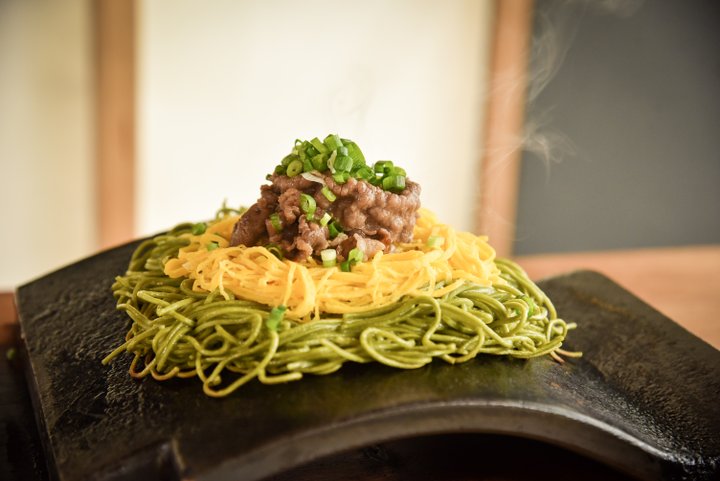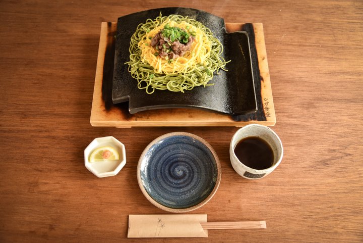 1番の人気メニューは、志賀さんの地元である山口県下関市の郷土料理「瓦そば」。熱々の瓦の上に茶そばと具材を乗せ、めんつゆでいただくユニークな料理です。シガ食堂では、西尾の抹茶を使用した茶そばやあいち牛など、愛知県産の素材で作るのがこだわりです。