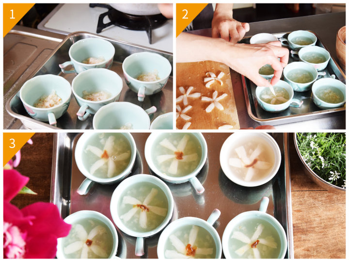 1.下段はライチのみじん切りが入る 2.花の形が崩れないようライチを並べる 3.水を張ったバットで冷やし固める