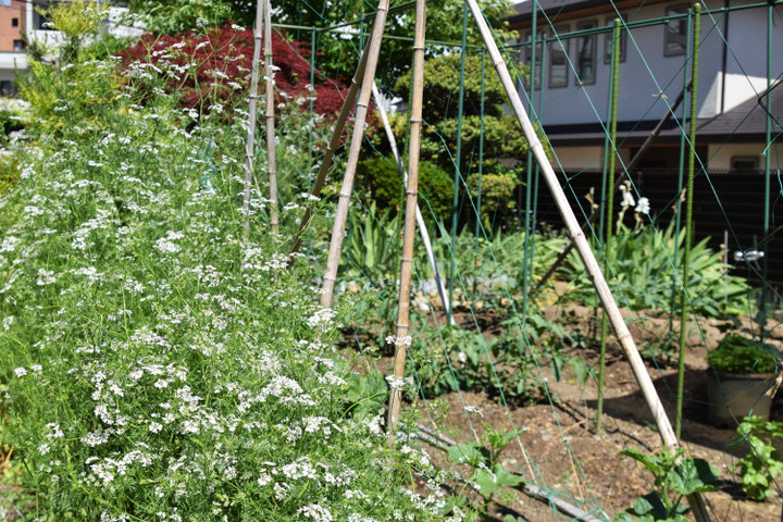 畑のパクチーも準備。現地では白い花も食べるのだそう
