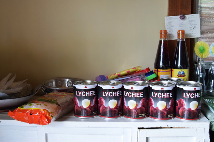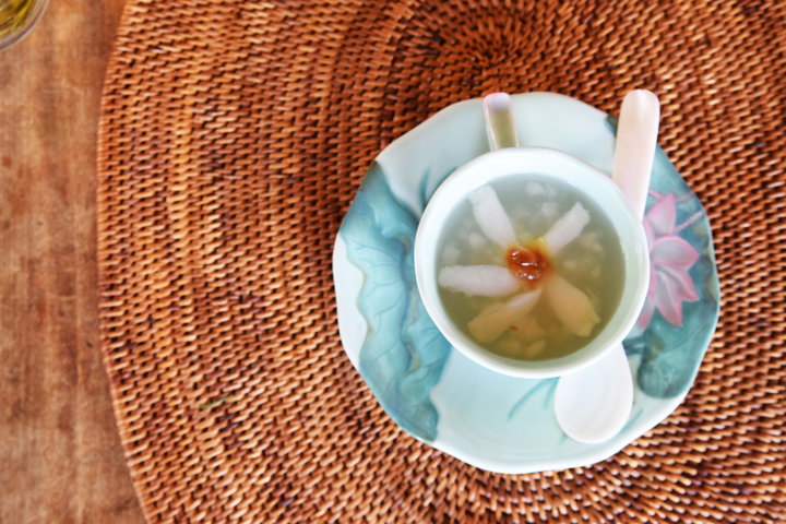 「ライチのゼリー」は、まず、みじん切りしたライチと缶詰のシロップを混ぜたゼリー液を、カップの7分目まで流し入れ10分ほどおきます。 少し固まったら、表面にライチを5等分して花びら状に並べ、竜眼をトッピング。残りのゼリー液をスプーンで静かに流しいれ、冷やします。 竜眼は漢方にも使われる食材。彩りだけでなく、食欲のない時などにも取り入れたいですね。