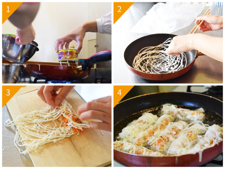 1.穴の開いた缶詰から衣を流し入れる 2.焼き上げた皮を破けないように引き上げる 3.レース状の皮で具を包む繊細な作業 4.浅めの油でカラッと揚げればできあがり