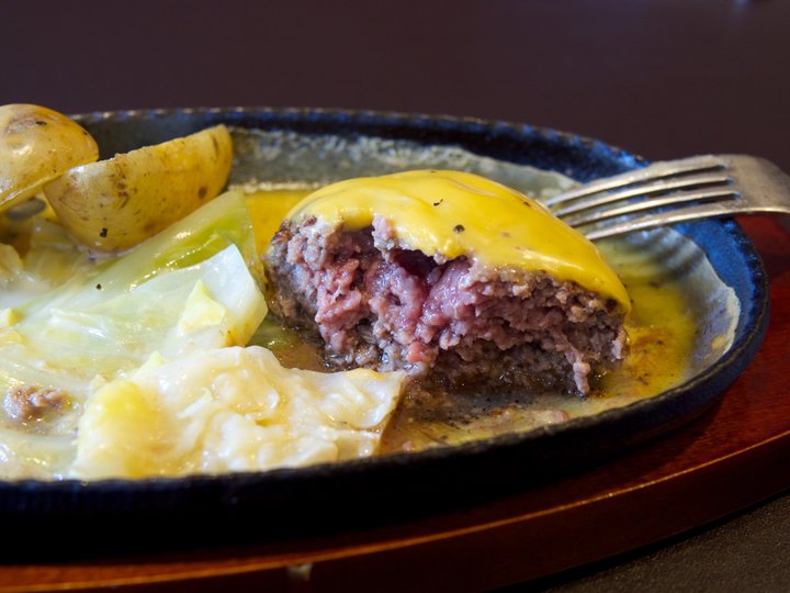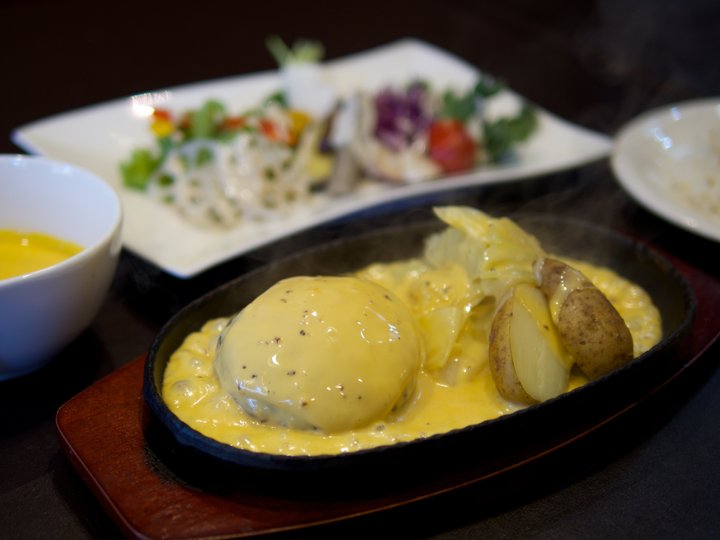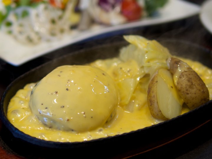 ハンバーグは北海道産の国産牛肩ロースのみを使用。中はややレアな焼き加減で肉汁がジュワッと滲み出てきます。定番のチーズソースの他に、トマトソースや赤ワインデミソース、タイ風カレーソースも選ぶことができますよ。