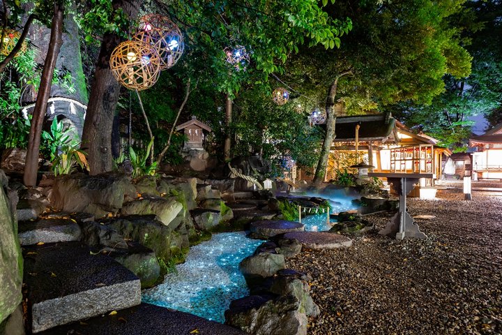 地下からあふれ出たご神水が流れる小川をライトアップ