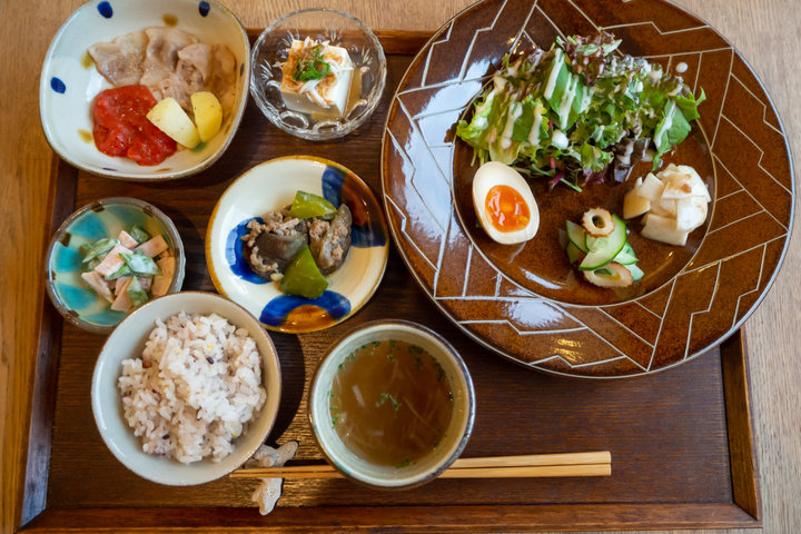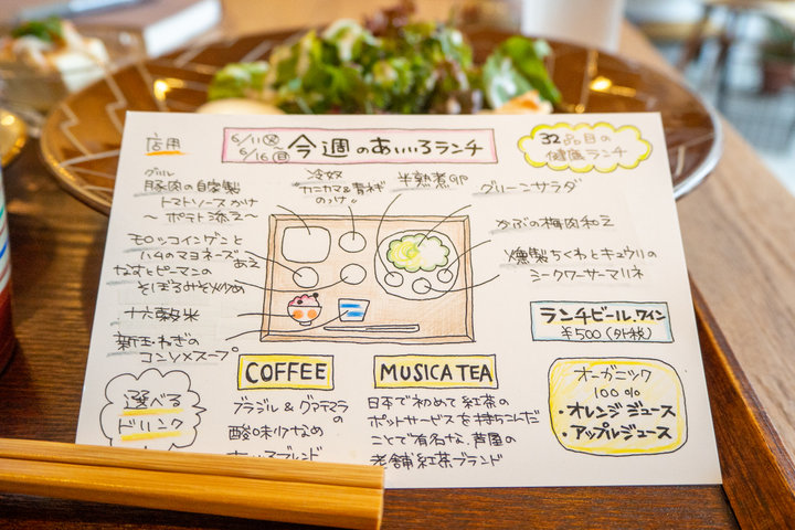 「あいいろ」の看板メニューといえば、身体にいい食材をたくさん使った週替わりのランチ。サラダ、惣菜6種、メイン、スープ、健康ご飯に加え、ハンドドリップでいれたコーヒーまたは、MUSICAティーが選べます。必ず30種類以上の品目を提供しているというランチは、手書きのお品書きを含め、丁寧さが際立つこだわりの逸品。