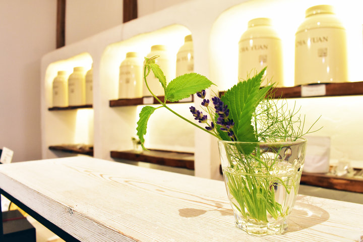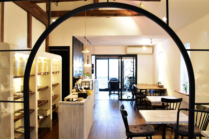 ツタに覆われた入口の扉を開けると、天井が高く、開放感あふれる店内が広がります。テーブルや窓辺など、ところどころに愛らしい草花が飾られた心地よい空間が、気持ちをほっと和らげてくれます。