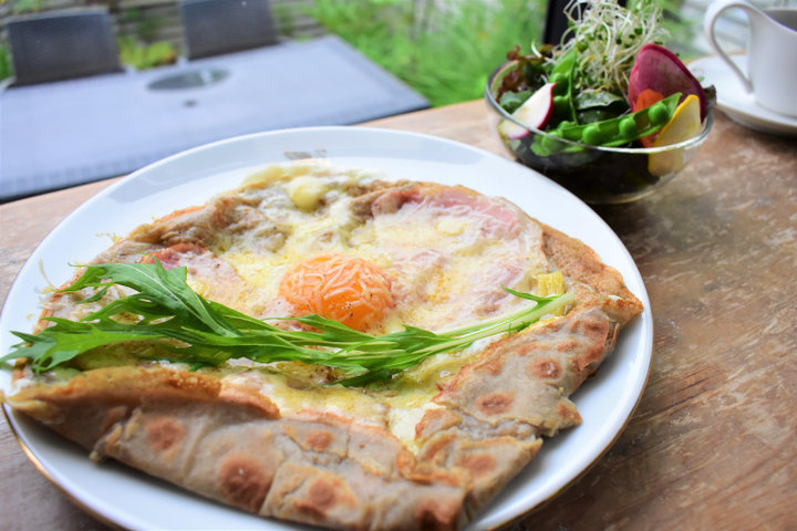 明るい日が射しこむテラス席で、フランスの郷土料理・ガレットをいただきましょう。この日は、4種類のラインナップのなかで一番人気の「コンプレット」をオーダーしました。 ガレットの生地は、そば粉と塩、水のみというシンプルなレシピ。「コンプレット」には、長期熟成ロースハムと卵、グリュイエールチーズがトッピングされています。 ほかほかの焼き立てをナイフで切って、ひと口パクリ。外側はカリッと、中はもちもちとした食感に驚きます。トッピングのハムは、宮城県にある手作りハム工房「岩出山家庭ハム」のオリジナル。野菜の煮込み汁やハーブなどに漬け込み、スモークした濃厚な風味が、素朴な味わいの生地にマッチします。 見た目以上にボリュームがあり、食べ応えのあるひと皿です。
