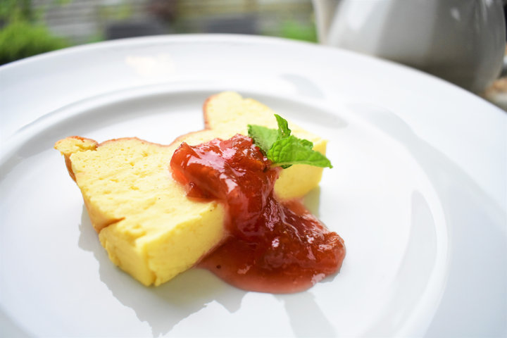 チーズテリーヌはクリームチーズとサワークリームを混ぜ合わせているので、コクがありながらも、後味はさっぱり。なめらかな口溶けもたまりません。トッピングされたいちごジャムもハンドメイド。甘さひかえめで、いちごそのもののおいしさがギュッと詰まっています。