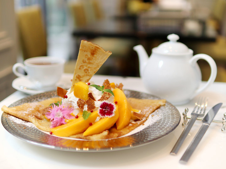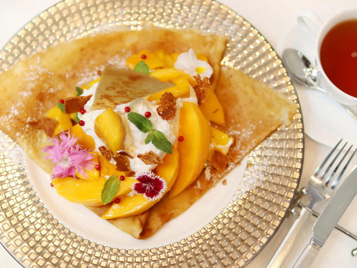 デザート系のクレープも1026円からあります。なかでもイチオシは季節限定のプレミアムクレープ。旬の果実や素材を惜しみなく使って、見た目も味わいもゴージャスです。 7月末ごろまでは、甘くて果実味あふれるアップルマンゴーをふんだんに盛り込んだクレープ(写真)を用意。これから秋にかけては、クリを使ったモンブラン風になど、季節に合わせていろいろと考案中なのだそうです。