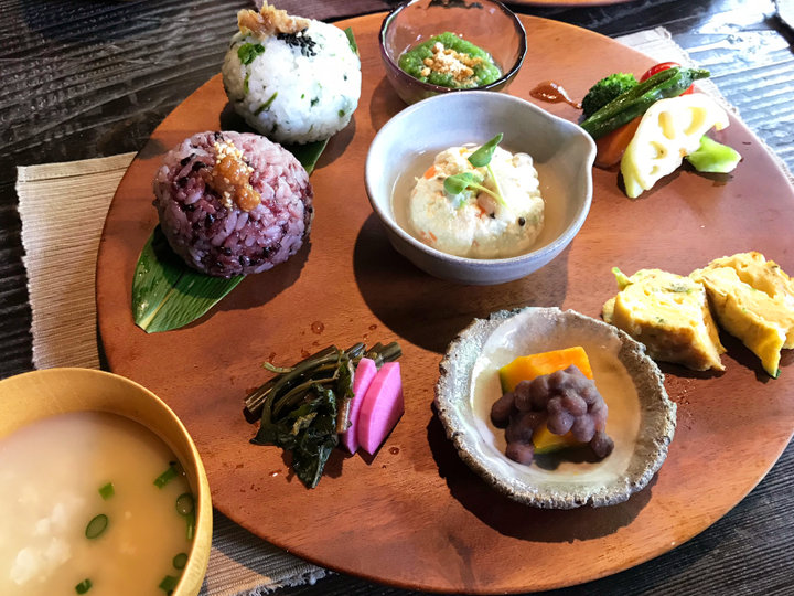 庭の眺めが素敵なカフェでは、ランチに地元農家の野菜や豆腐を盛りこんだ「里山の四季のおにぎりプレート」をいただけます。少しずつよそわれた惣菜は素材一つひとつの風味が濃厚で、食感も絶妙。おにぎりに添えられた生姜とくるみの味噌も深い味わいでした。