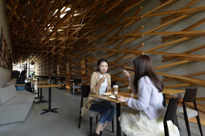 木組み構造の天井と壁が続く、「スターバックス 太宰府天満宮表参道店」
