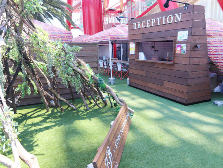 「Open BBQ site」は、青空に映える真っ赤な大観覧車の下周辺に設置されています。大きなヤシの木や青々とした人工芝が、南国リゾート気分を盛り上げてくれます。開放感もたっぷり。