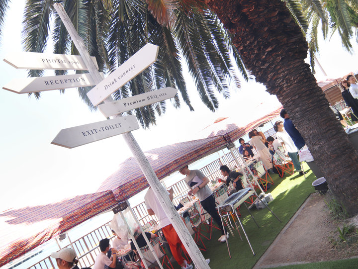 レセプションで受付を済まして奥へ進むと、大きなヤシの木や緑の人工芝が美しいBBQサイトへ。まるで海外の南国リゾートへ訪れたようです。 「Premium」「Seaside」「Open」の3種類のBBQサイトに分かれ、各BBQサイト料金+フリードリンク代で利用ができます。食材は持ち込み無料です。