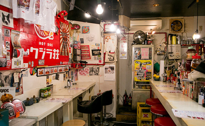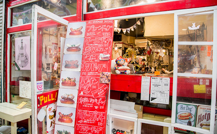 さまざまな飲食店が立ち並ぶ抜け道のような細い商店街へ入ってすぐのところにあるのが、赤い看板が目を引くこのお店。手作りソーセージで作るホットドッグのお店『クジラ荘』です。