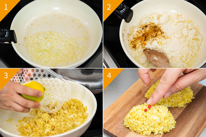 グルメにコスメにと最近、話題の瀬戸内レモン。代表的な産地、広島県では国産レモンの5割近くを生産しているのだとか。今回はレモンをターメリックやクミンなど身近なスパイスとミックスしておにぎりに。酸味、スパイシーな辛味、少しの苦味…。複雑な味が組み合わさり、ついつい食が進みます。 【材料】(2人分) ・ごはん…お茶碗軽く2杯分 ・オリーブオイル…大さじ1 ・ターメリックパウダー…小さじ1/2 ・塩こしょう…適量 ・玉ねぎ…1/4個 ・すりおろしにんにく…小さじ1/2 ・クミンパウダー…小さじ1 ・レモンの皮…小さじ1/2 ・ピンクペッパー…お好みで ・パセリ…お好みで