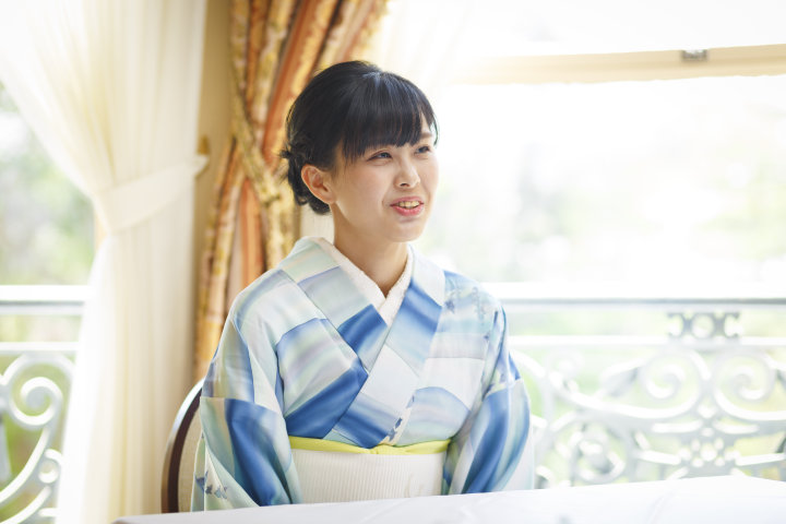 ― 青色を基調とした爽やかなコーディネートですね。 暑い時ですので。爽やかにブルーと白のグラデーションの単衣です。キモノを着ると、自分を特別な女の子にしてくれる気がします。「魔法のドレスみたい」というセリフを漫画の中でも書きましたが、普段からそう感じることが多くて。やはりキモノを着ていると大股で歩けないし、洋服みたいに気軽じゃないかもしれませんが、足を揃えておくとか、意識せずに勝手に所作が身について、自然と女性らしくなれるのはいいことだなと思っています。 ― 漫画には関西のお店などが登場しますが、1話は京都の珈琲店『六曜社地下店』ですね。 全て実際に訪れてみて漫画に描きますが、いくら素敵なところでも絵にならないところや物語に合わないと判断したところは登場させません。1話のお店は、もっと他にも候補がありました。四条河原町界隈にある老舗の喫茶店なども候補で考えて行きましたが、キモノが似合っていて、1人でじっくり本を読んで楽しめて、主人公のももちゃんが初めて初恋の人、椎名さんと出会う場面なので、椎名さんが行ける場所はどこなのかということで決めました。漫画の中では、関西のおでかけスポットを、京都・奈良・大阪・兵庫・滋賀・和歌山を回る感じで、ももちゃんが各地へ訪れてご紹介をしていますが、物語は、キモノやお出かけ、人との出会いや失恋などで、ももちゃんの成長を描けたらと思っています。