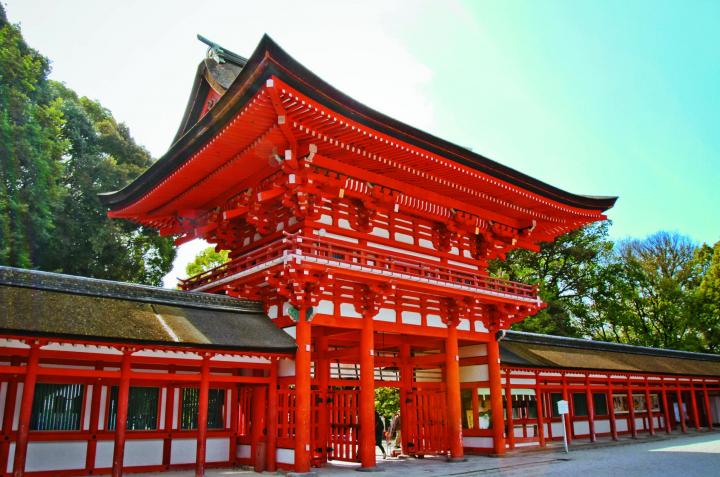糺の森をぬけると朱色の鳥居が現れる