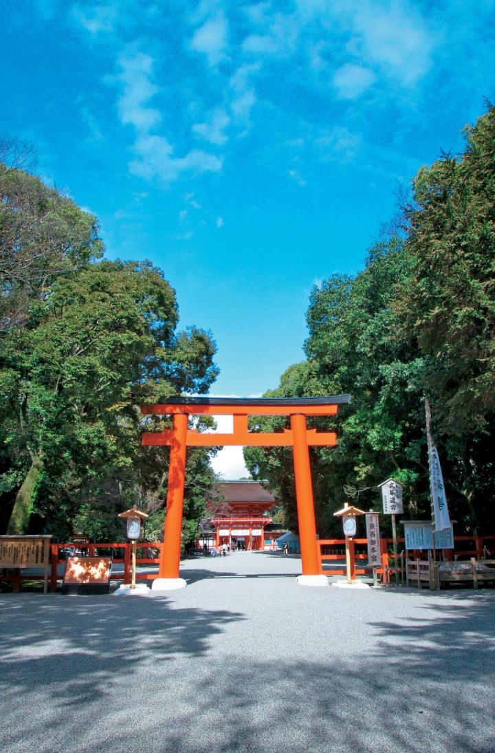境内は、太古からの原生林が今なお残る糺の森に静かにつつまれています。森の息吹を感じながら表参道を歩くにつれ、心が澄みわたっていくよう。 神紋の双葉葵はハートの形に似て、「葵」→「あふひ」→「逢ふ日」に転じることから、縁結びのご利益を秘めているそうです。