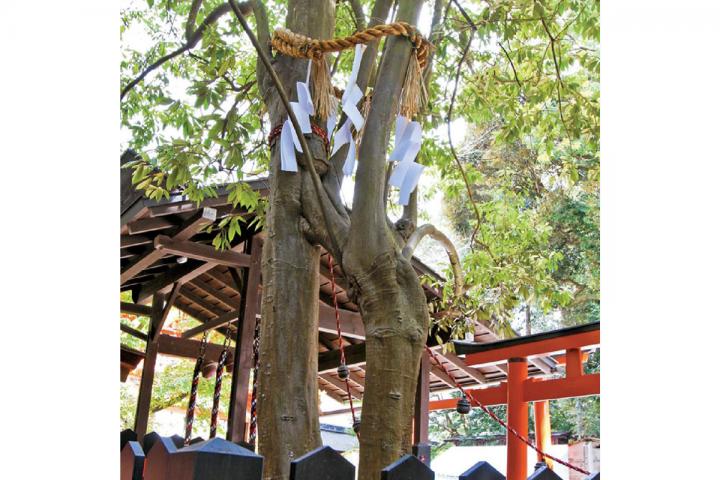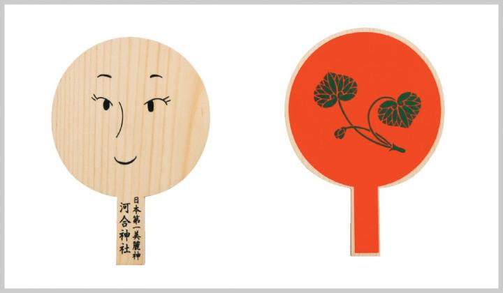 鳥居をくぐり荘厳な楼門へと向かうと、その手前に「相生社(あいおいのやしろ)」という小さなお社があります。2本の木が途中で1本になる「連理の賢木(れんりのさかき)」が立っていて、縁結びの象徴とされます。 美麗の神様を祀る摂社の「河合神社」では、手鏡の形をした鏡絵馬が人気。顔の描かれた面を自分の顔にみたて、化粧をほどこして美麗祈願をしてはいかが。