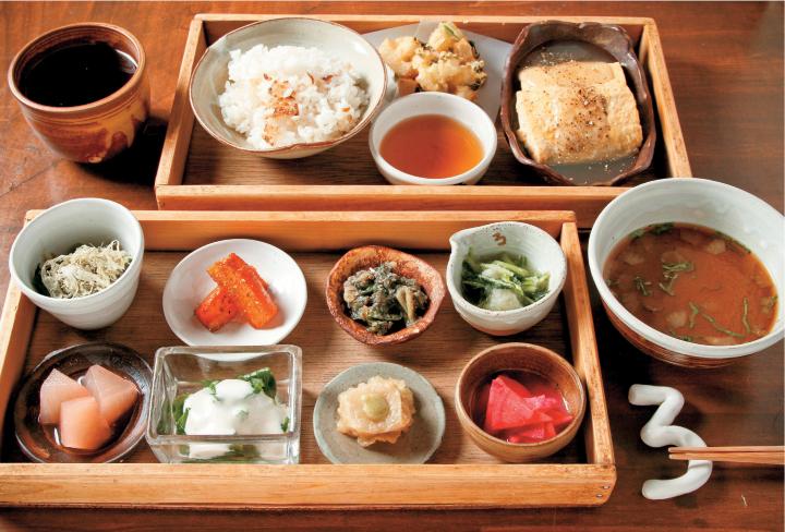 出町桝形商店街のすぐ近く、住宅街に溶け込んでいるのは、古い町家を改装した「出町ろろろ」。ほがらかな店主・田中隆寛さんが、京都・大原の旬の無農薬野菜などをふんだんに使った和食を心を込めて作ってくれます。 いろいろなものがちょっとずつ2段の木箱に入ったお昼の「ろろろ弁当」が人気。1段には豆皿に盛られた8品のおばんざい、もう1段には土鍋で炊いたごはんやだし巻の黒コショウあんかけなどが並び、上品で滋味深い味わいです。