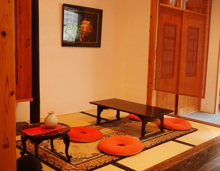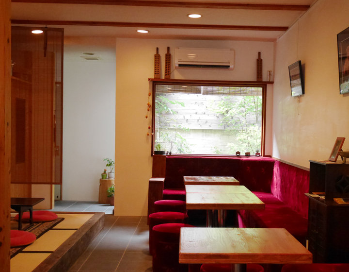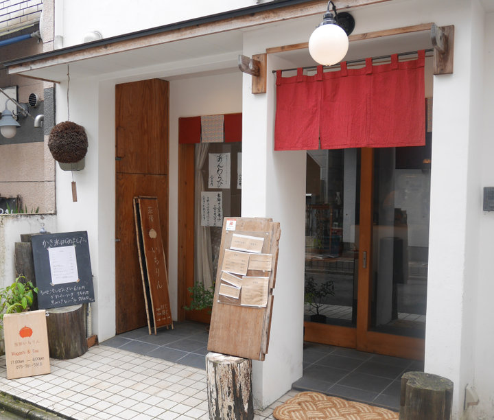 銀閣寺橋から哲学の道を南へ2分、西へ折れると白川通へ出ます。さらに、通りを北へ行き一筋目の路地を入るとすぐのところが「茶房いちりん」です。和菓子屋さん風の赤いのれんを目印にしてくださいね。