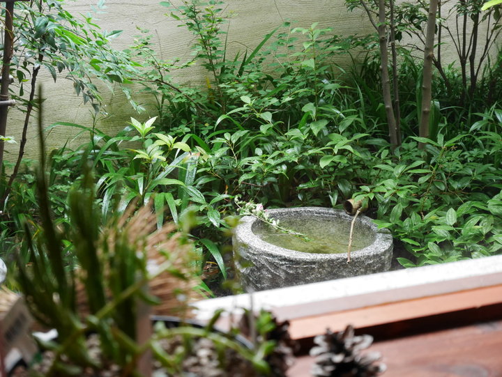 店内は、京都の古い家によくある間口が狭く奥行きが深いタイプ。ナチュラルテイストの内装にピンクのインテリアが映える店の奥には、坪庭が緑をたたえています。庭を望むこの窓は、お店を始めるにあたり壁を抜いてわざわざしつらえたそう。